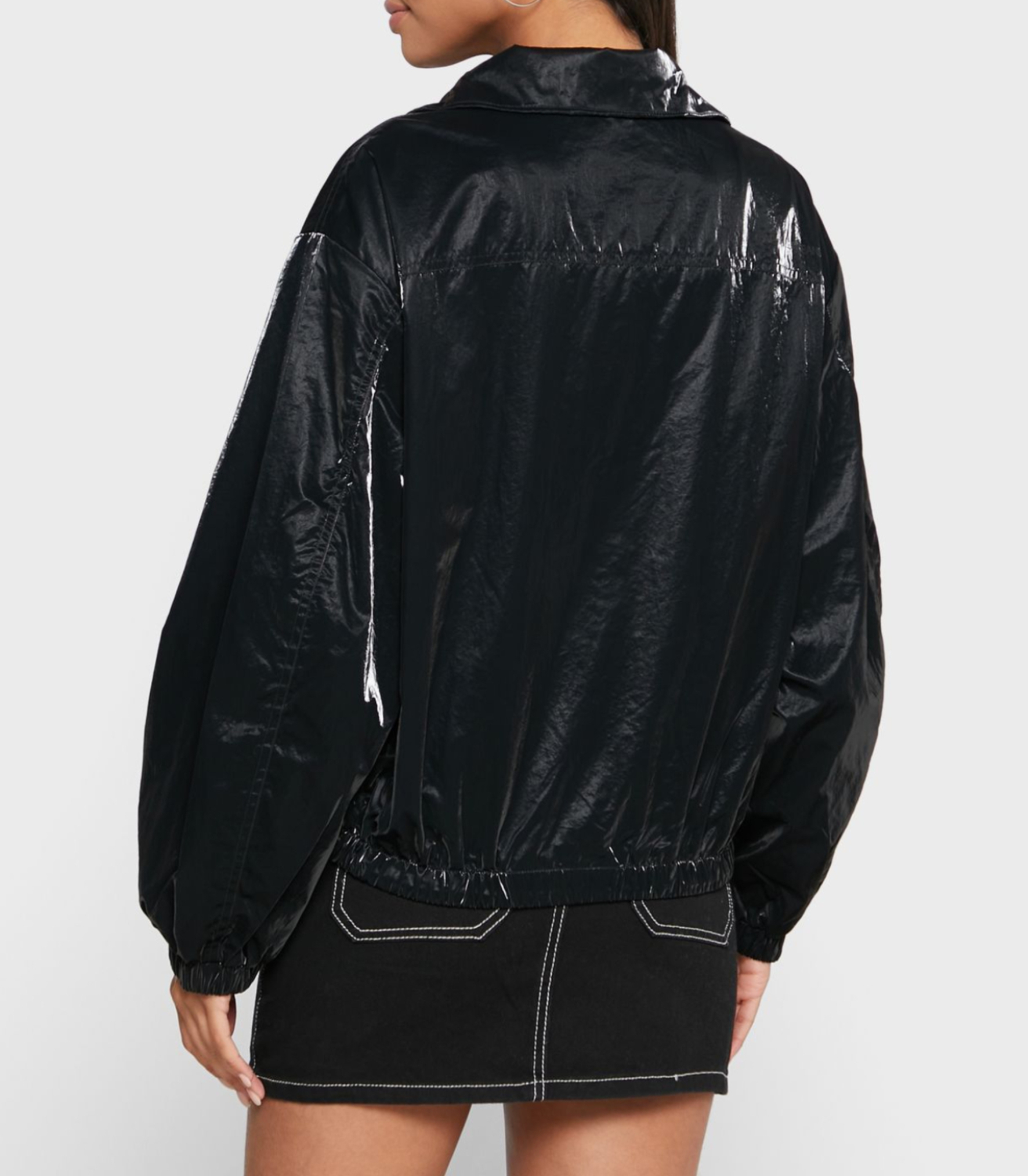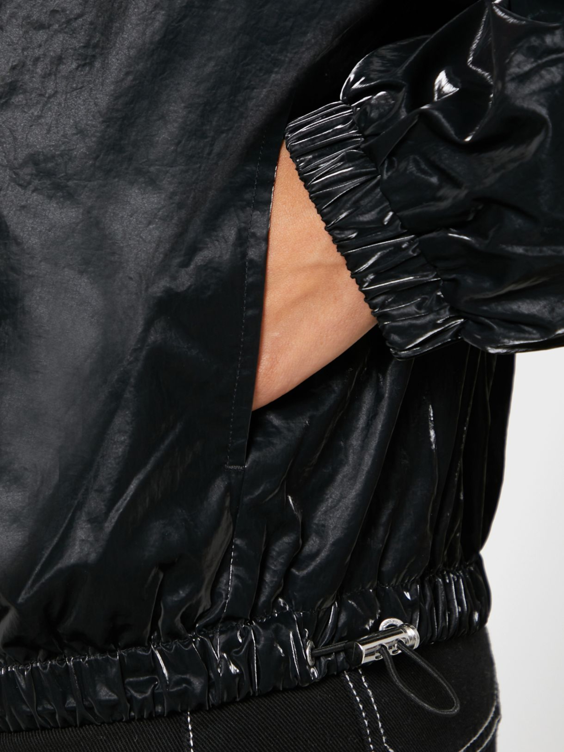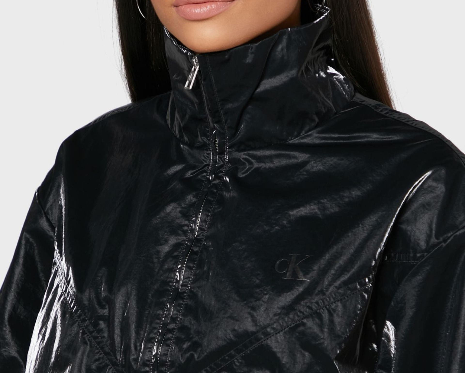 Moteriška juoda blizganti striukė iš Calvin Klein kolekcijos. Užsegimas užtrauktuku. Dvi šoninės kišenės, užsisega spaude. Apatinė dalis reguliuojasi. Nuleistos pečių siūlės, rankovės užbaigtos rankogaliais su guma. Striukė neapšiltinta su pamušalu.