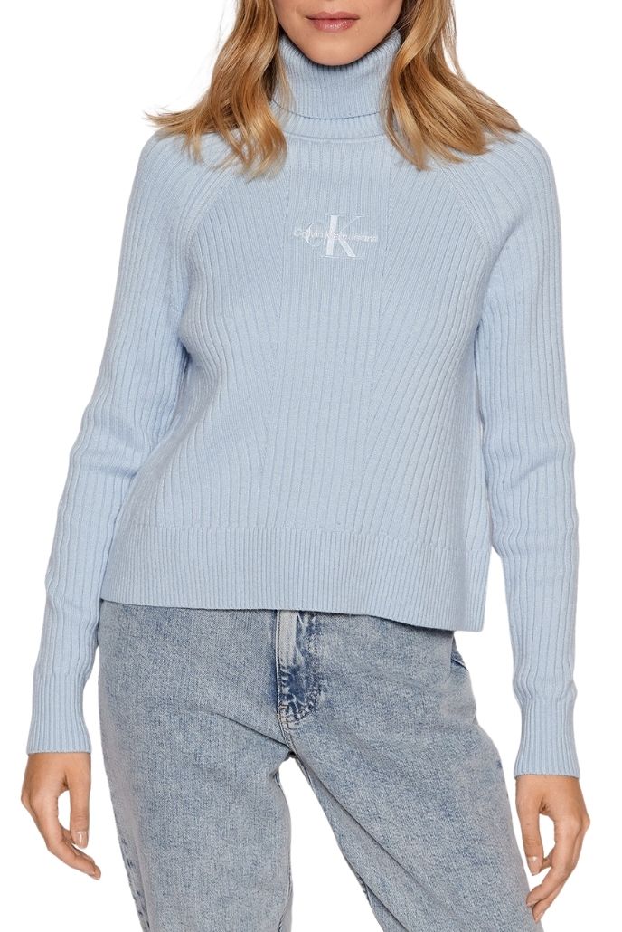 Laisvo modelio megztinis aukštu kaklu iš Calvin Klein Jeans. Vilnos ir viskozės mišinio tvirtas mezginys su raštu. Ant krūtinės išsiuvinėtas logotipas.