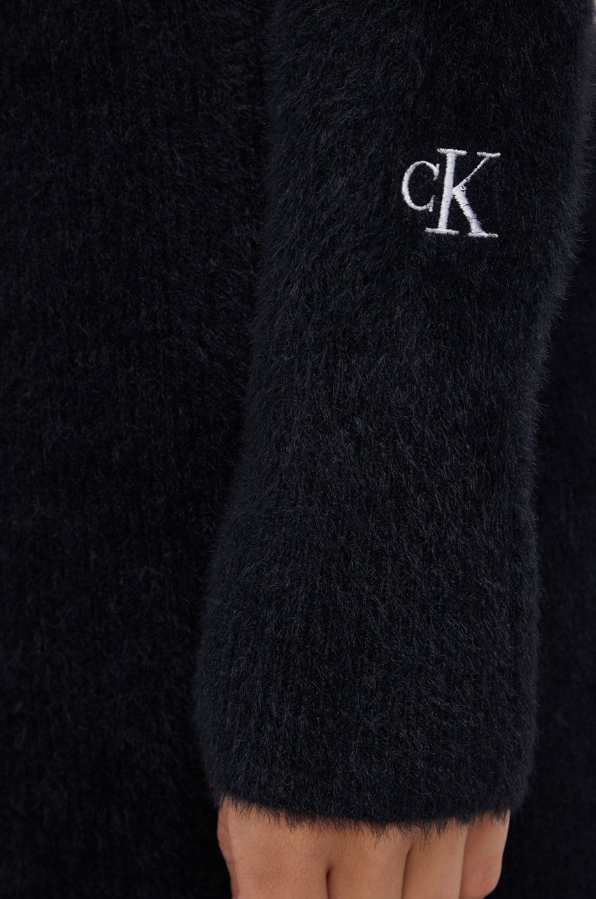Šilta suknelė iš Calvin Klein Jeans kolekcijos. Paprastas modelis, vienspalvis dizainas aukštesne apykakle. Ilgos rankovės, nestoras, elastingas audinys. Nukritusi pečių linija. Siuvinėtas CK logotipas ant rankovės.
