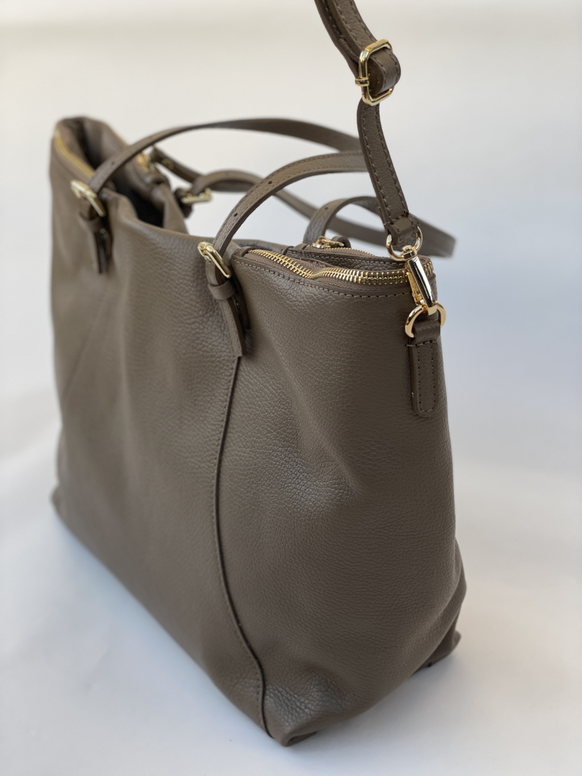 Šis stilius tinkantis kasdieniam gyvenimui. Didelė rankinė uždaroma užtrauktuku ir metaliniu magnetu. Funkcionali rankinė su 2 odinėmis rankenomis. Erdvus pagrindinis skyrius talpina A4 formatą. Papildomai reguliuojamas ir nuimamas dirželis (120cm.) Visos metalinės detalės auksinio atspalvio.