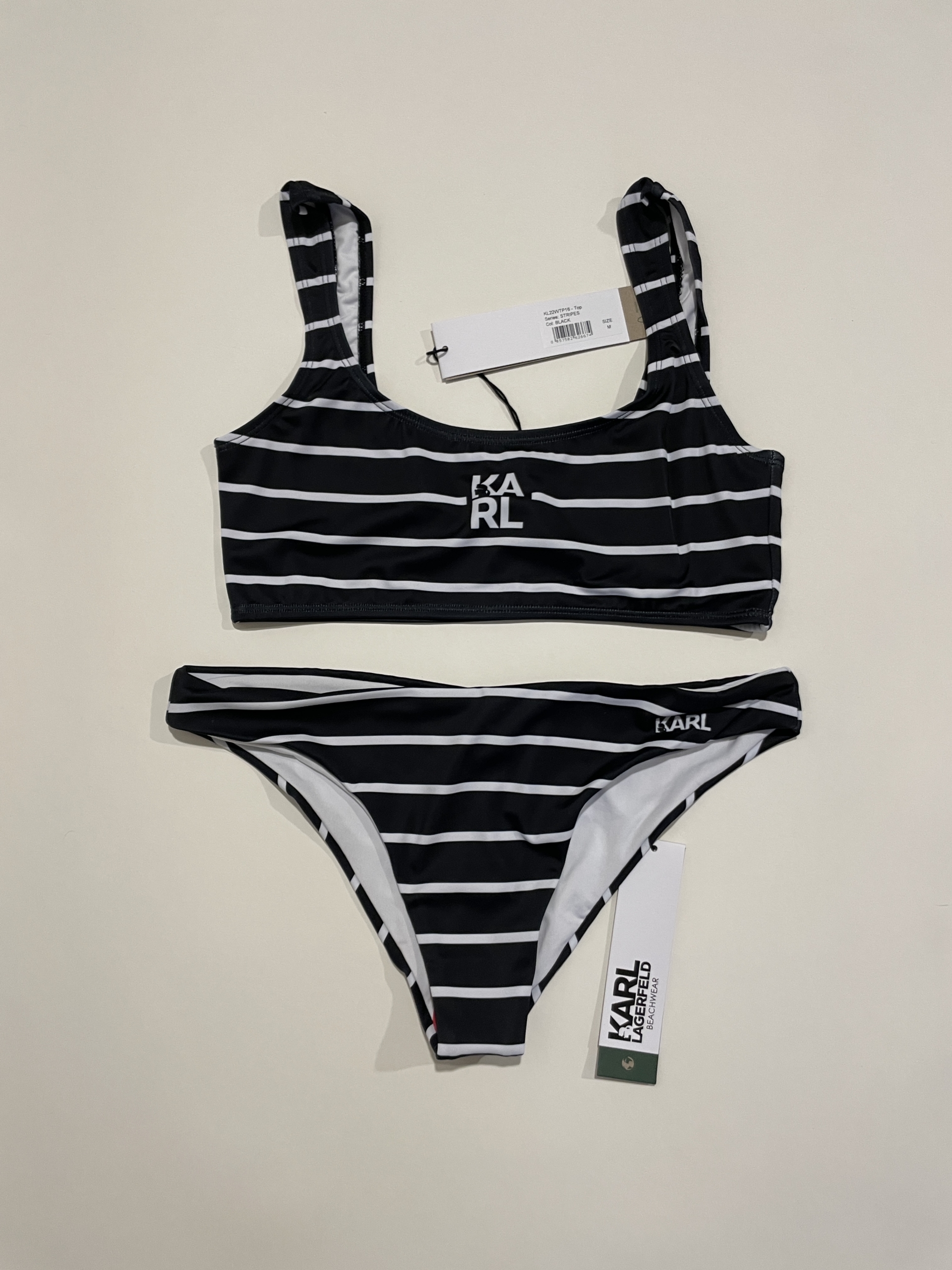 Maudymosi kostiumėlis iš Karl Lagerfeld kolekcijos. Liemenėlės kaušeliai be lankelių, be pakietinimo. Platūs dirželiai garantuoja maksimalų komfortą ir laikymąsi. Kelnaitės pagamintos iš švelnios medžiagos ir šiek tiek tempiasi. Liemenėlė ir kelnaitės turi papildomą medžiagos sluoksnį pamušalo pavidalu.