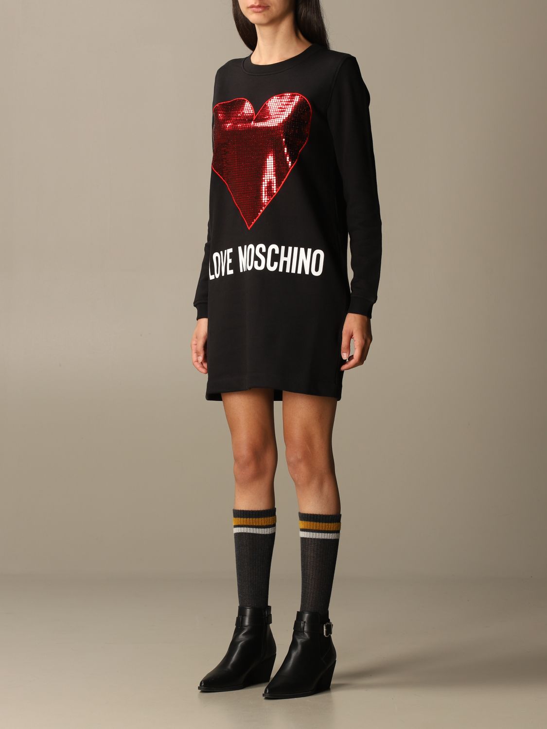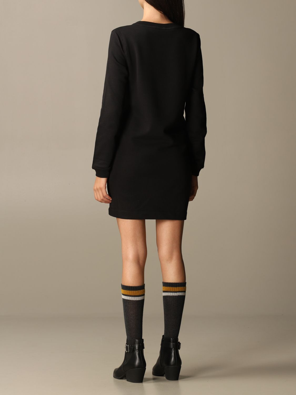Moteriška „Love Moschino“ trikotažinė suknelė. Pagaminta iš minkšto medvilnės audinio. Tiesaus kirpimo suknelė apvalia apykakle ir ilgomis rankovėmis. Kontrastingas spaudas su prekės ženklo logotipu. Love Moschino kolekcija išsiskiria unikaliu charakteriu.