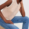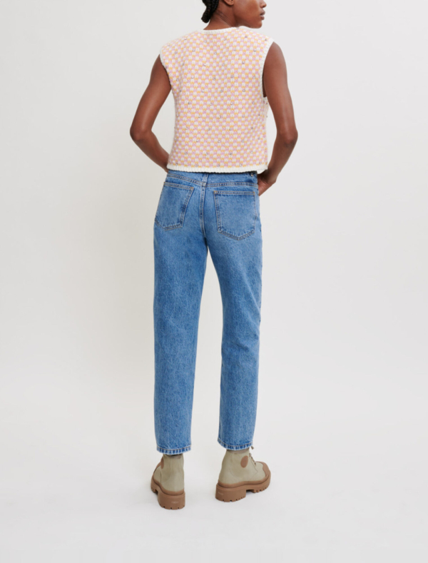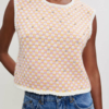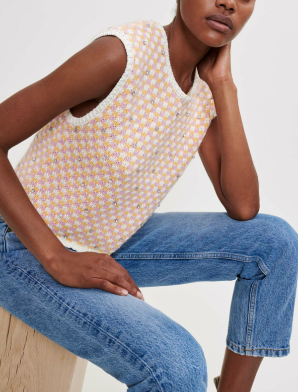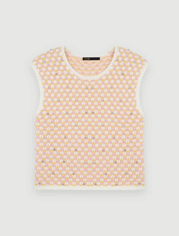 Švelnių spalvų tiesus megztinis be rankovių. Dekoratyvus mezginys su smulkiais cirkoniais. Apvali iškirptė.