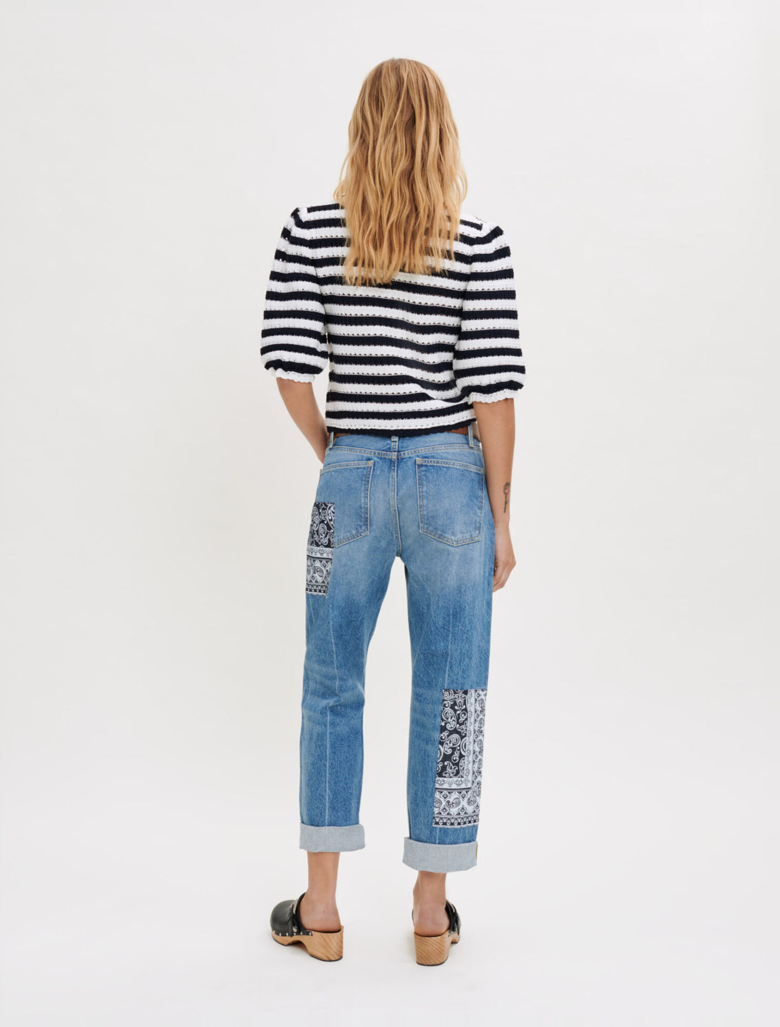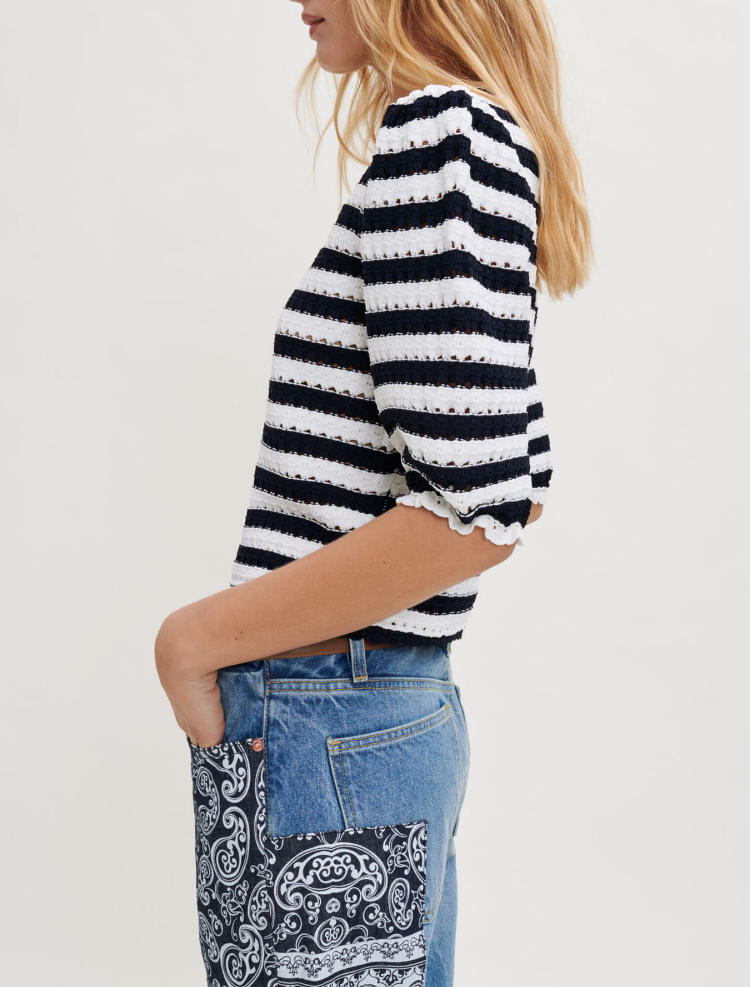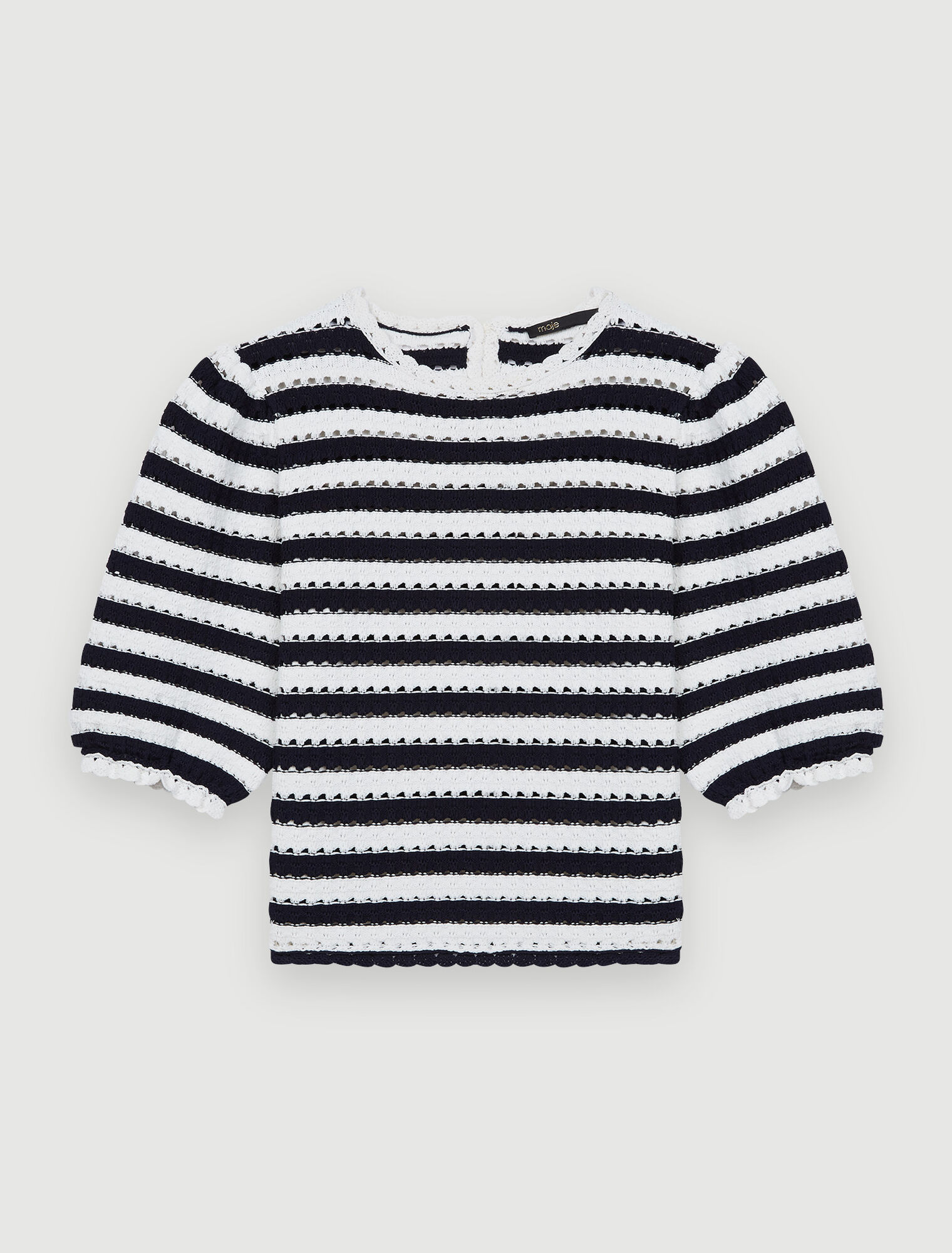 • Tamsiai mėlynos ir ekru spalvos dryžuotas mezginys