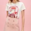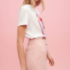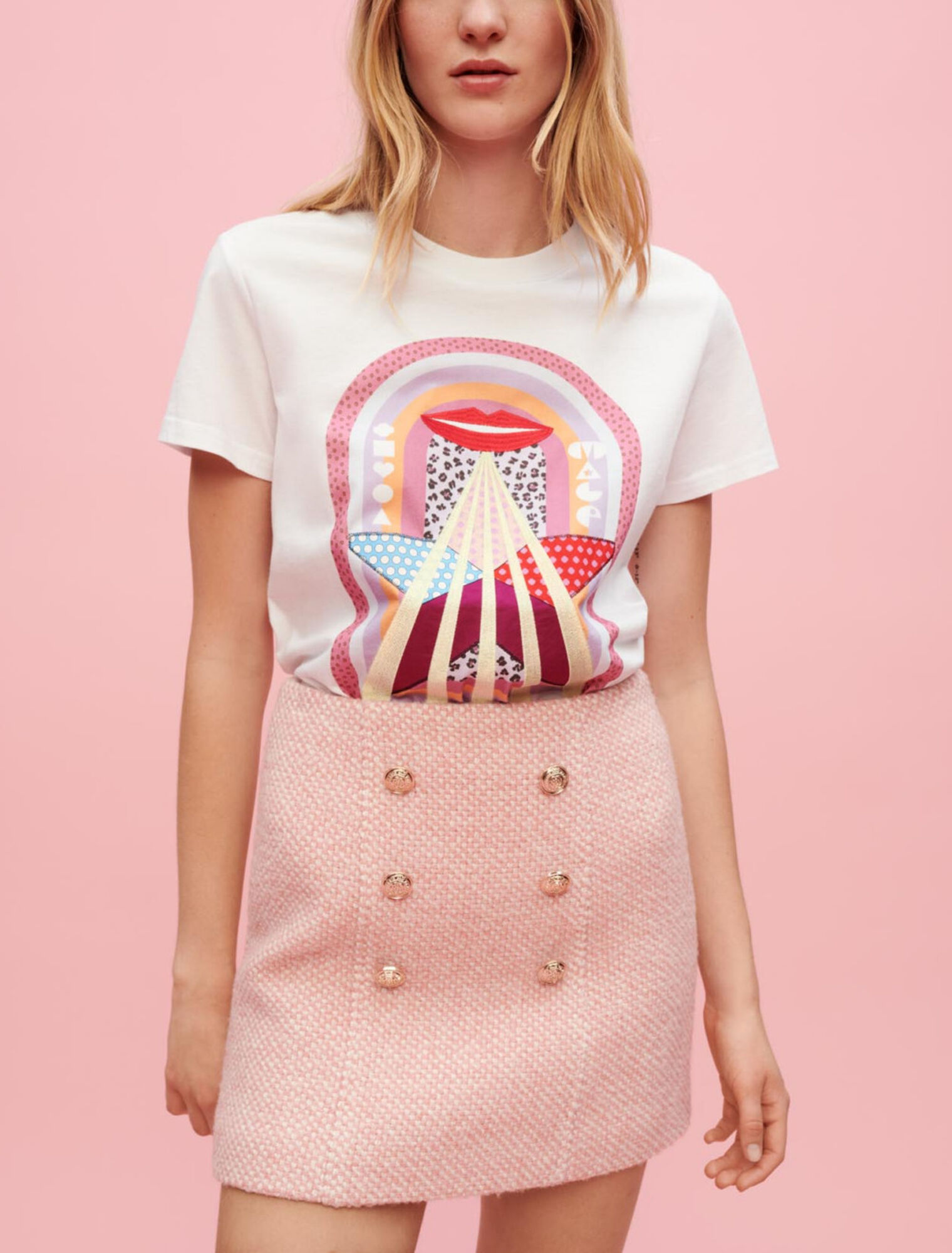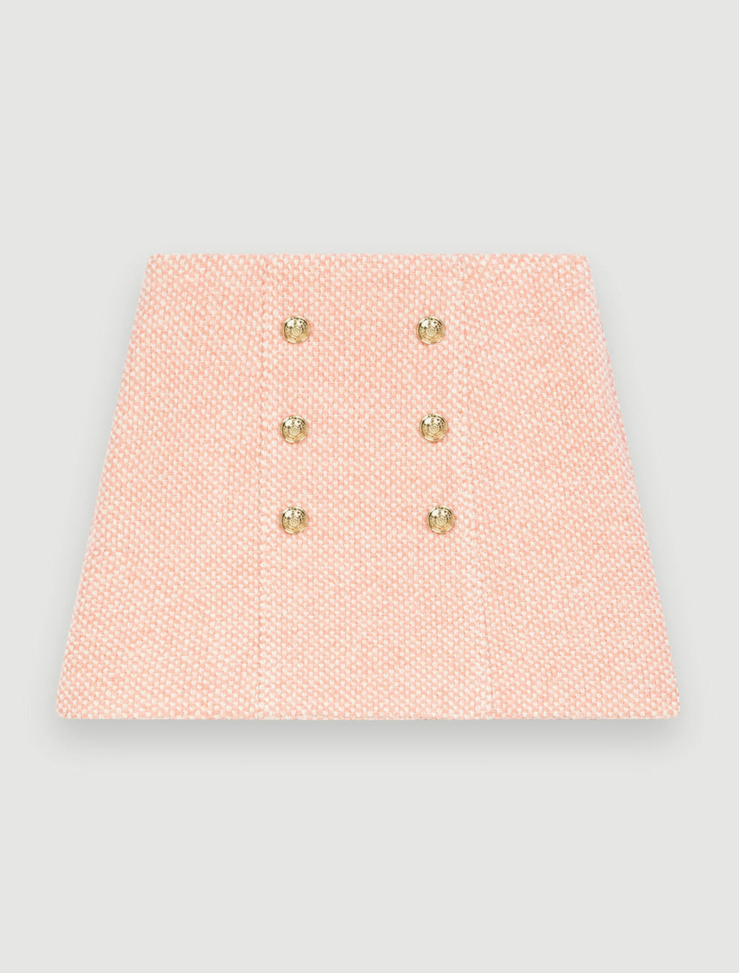 Trumpas, tiesus, priglundantis sijonas iš storo rožinio tvido audinio.
