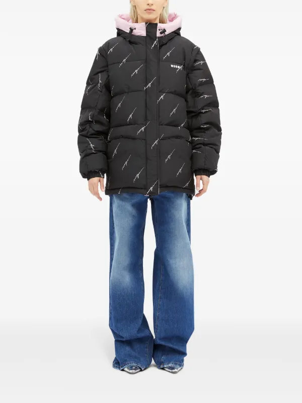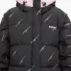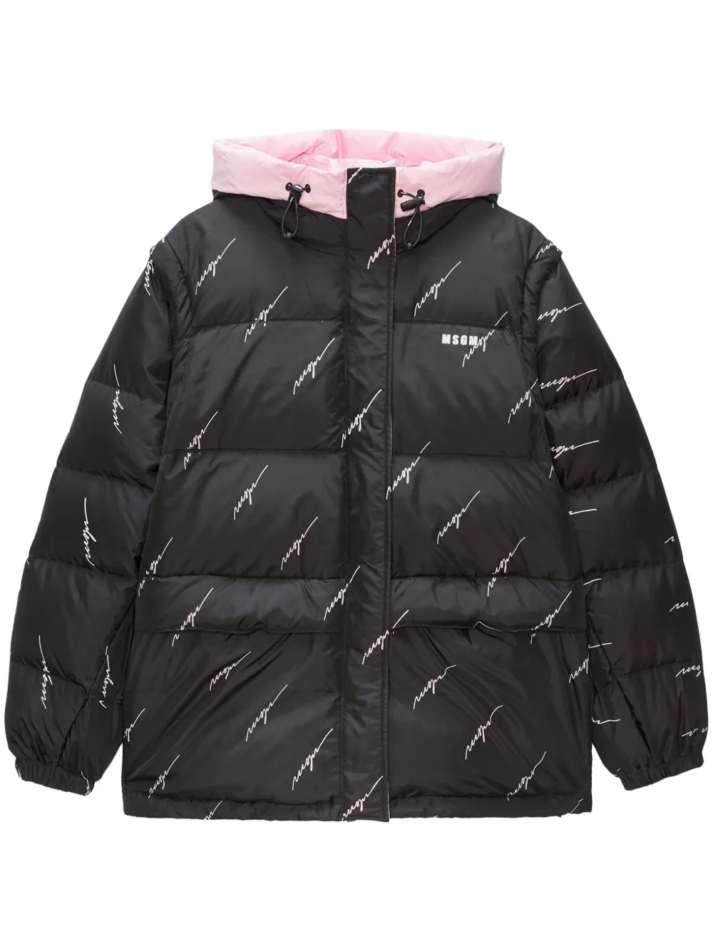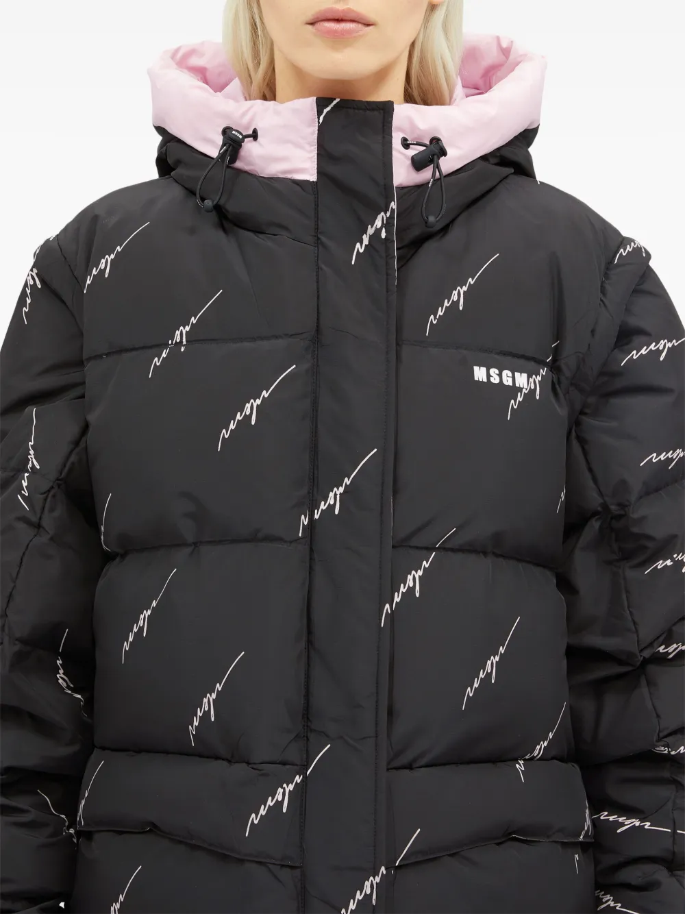 Stilinga ir funkcionali moteriška pūkinė striukė iš MSGM kolekcijos. Juodos spalvos striukė su švelniai rožiniu gobtuvu išsiskiria madingu kontrastu ir subtiliais MSGM logotipo užrašais visame audinyje.