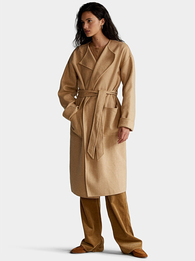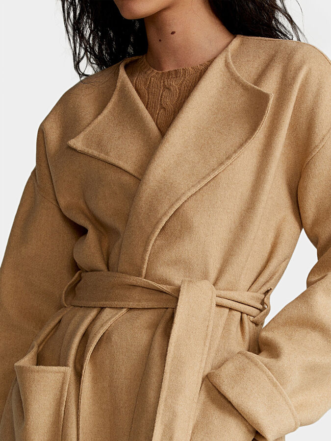 Smėlio spalvos paltas pagamintas iš vilnos mišinio audinio. Susiaučiamas dizainas be pamušalo, klasikiniai atlapai, tiesus apvadas, vidutinio ilgio. Diržu juosmuo, dvi priekinės kišenės.