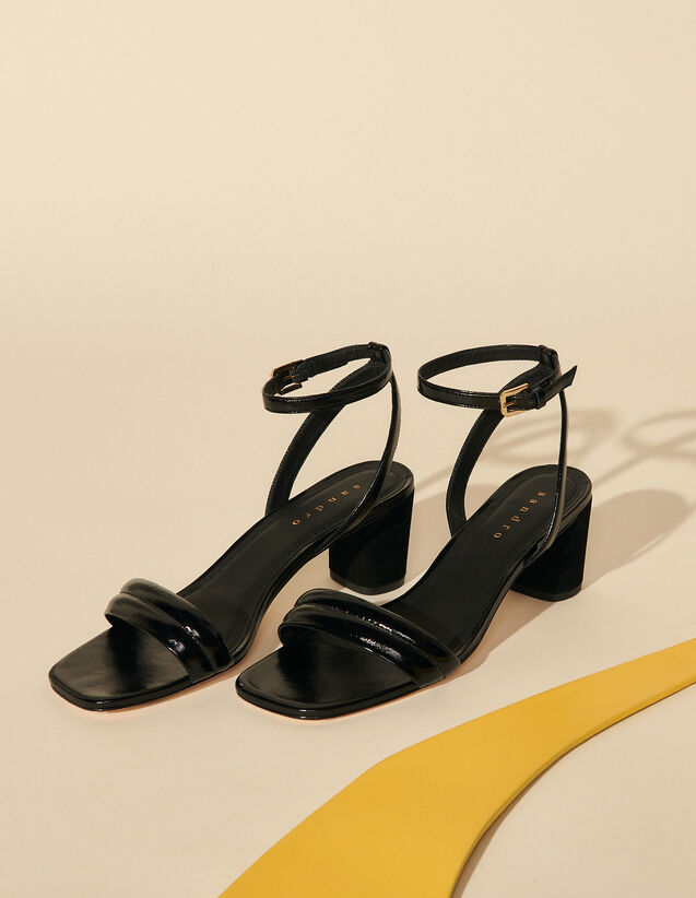 Sandro basutės ant kuklaus blokinio kulno. Pagamintos iš prabangios glotnios odos ir padengtos lakuota danga. Odinis vidpadis, vidus ir padas. Platus apvalus kulnas 6cm.