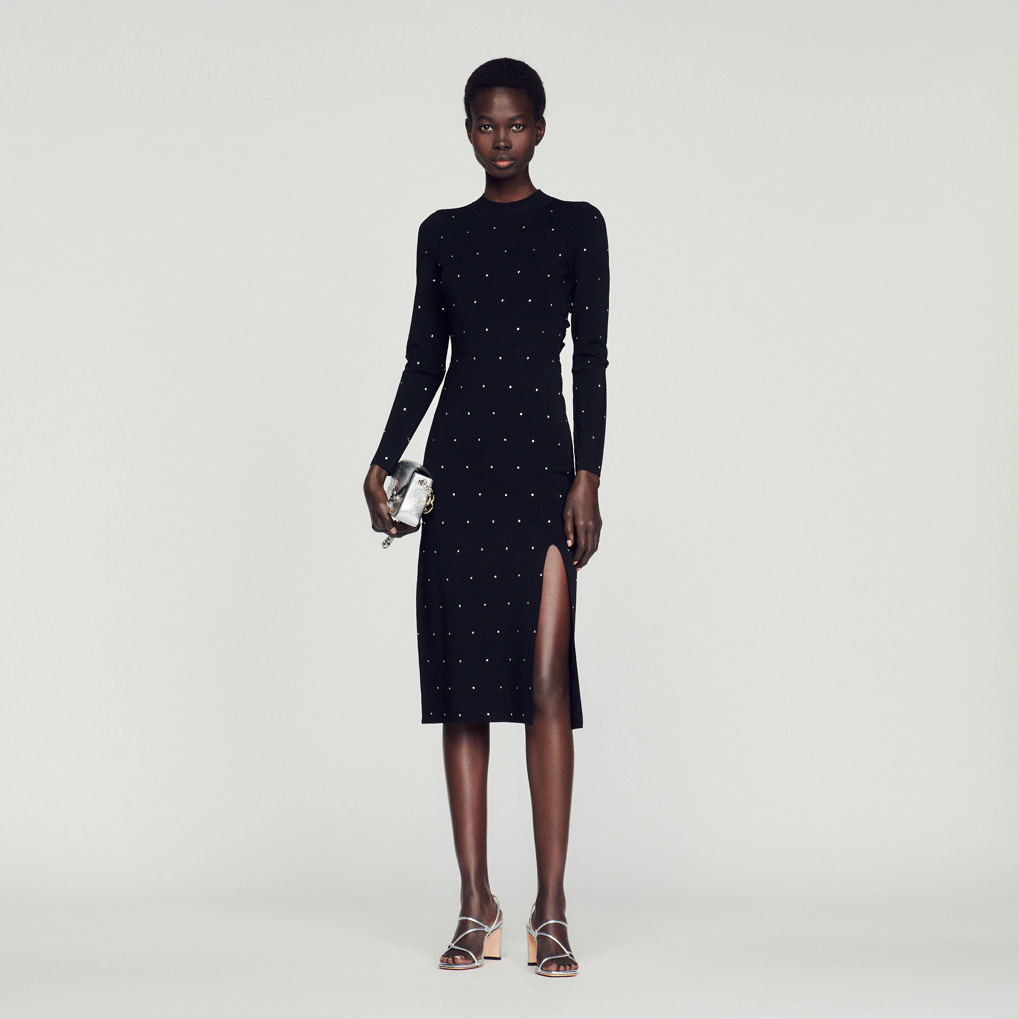 Ilga megzta suknelė apvaliu kaklu, ilgomis rankovėmis, skeltuku priekyje ir visame kalnų krištolo puošmena.