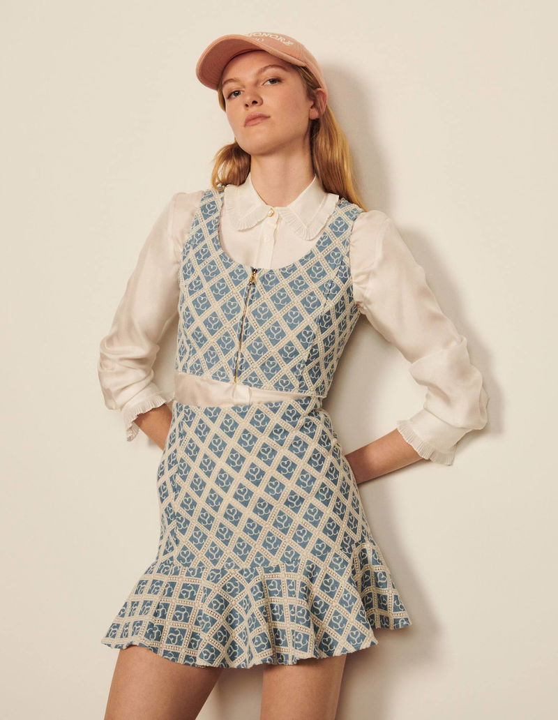 Trumpas platėjantis sijonas su raukiniais, dekoruotas žakardo gipiūriniais nėriniais su išskirtine dviguba S monograma.