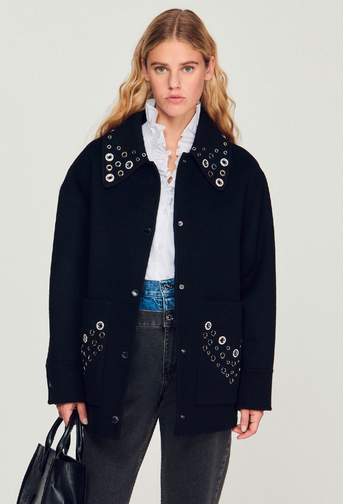 Laisvo modelio trumpas vilnonis paltas ilgomis rankovėmis, marškinių apykakle ir metalinėmis kilpelėmis puoštomis kišenėmis bei apykakle.