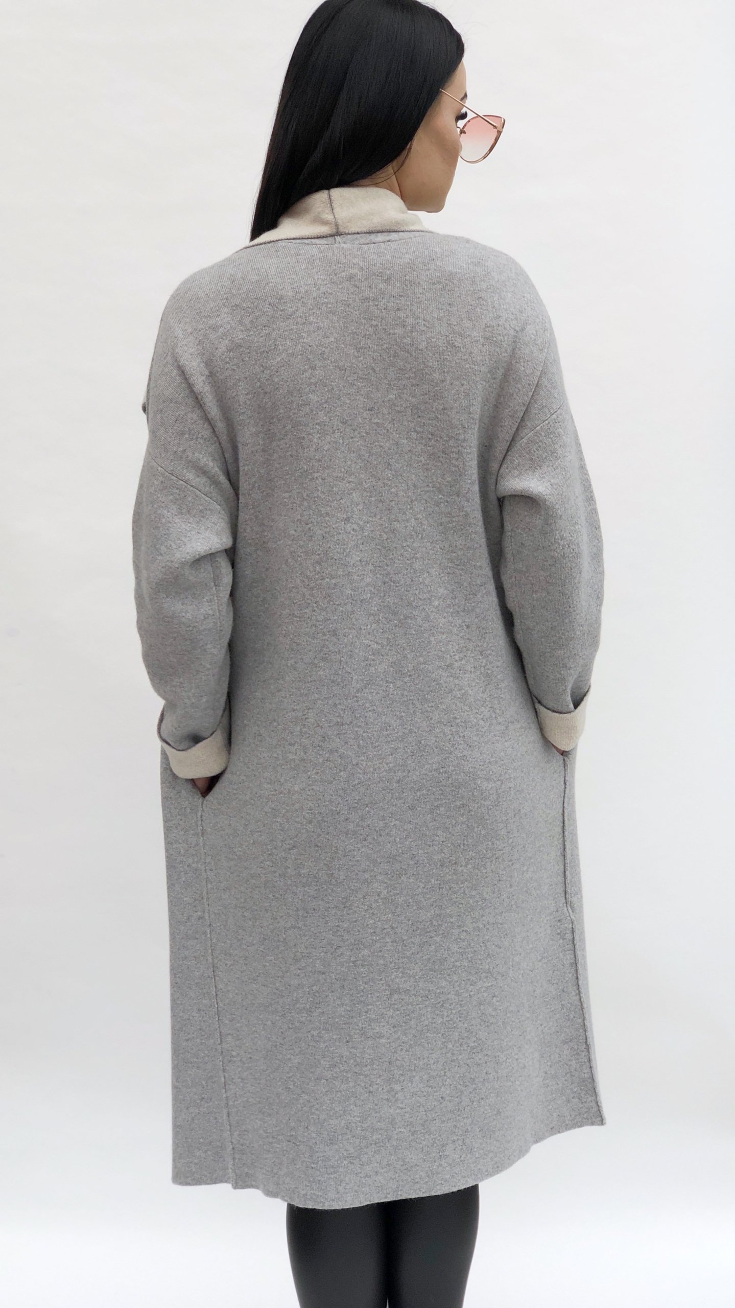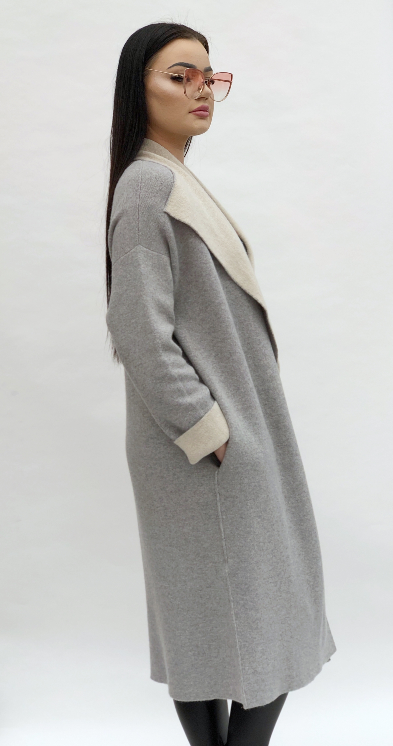 Modelio ūgis 180 cm, kardiganas L dydis.