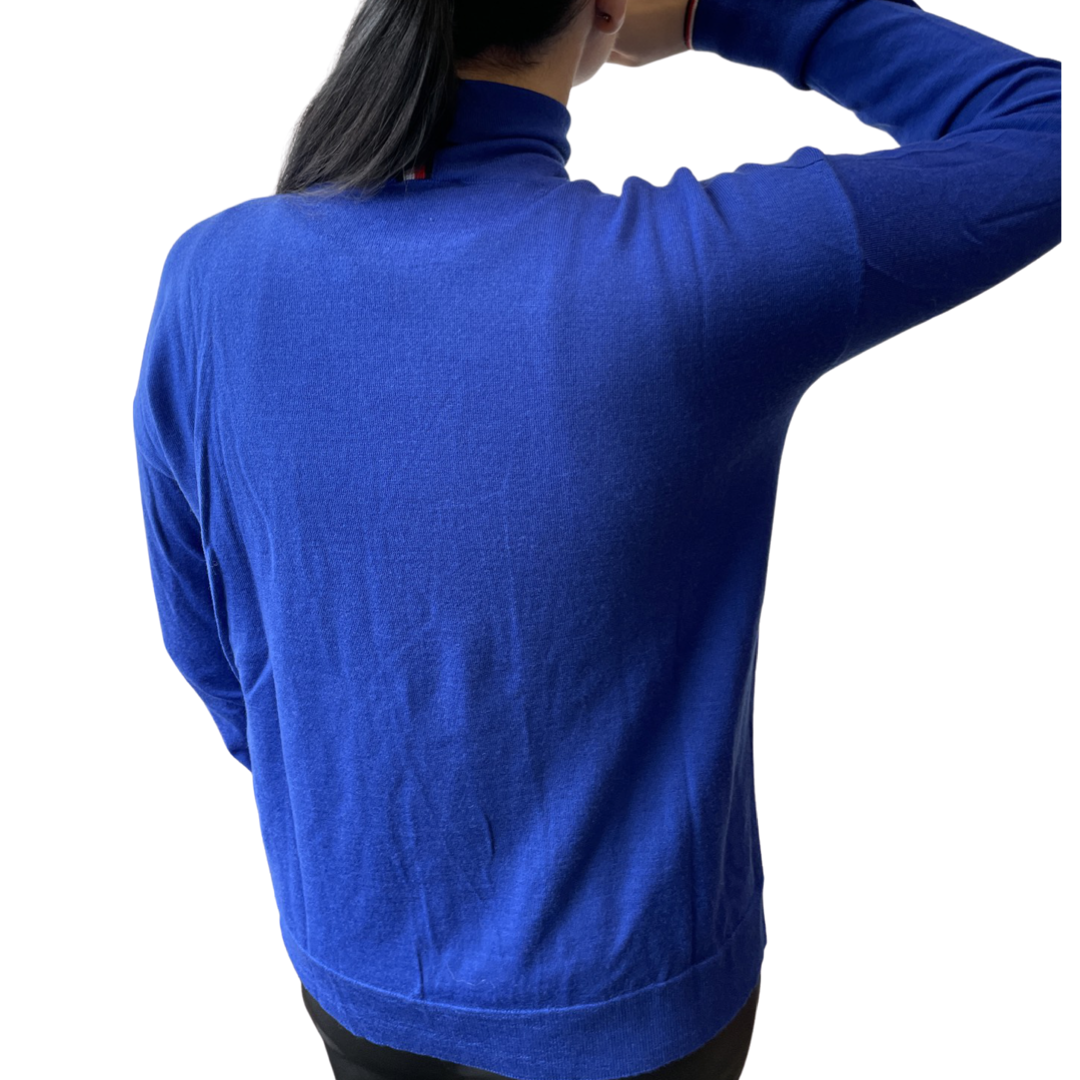 Šis moteriškas golfas pagamintas iš prabangios vilnos, plono mezgimo. Laisvas modelis, nuleistos pečių siūlės. Tommy juostelė apykaklės gale ir išsiuvinėtas logotipo ženklas ant rankogalio.