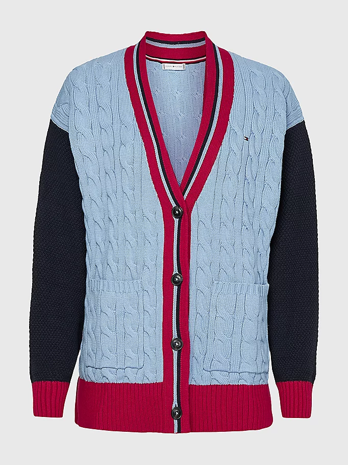 Spalvotas dizainas, trijų spalvų derinys. Laisvo kirpimo moteriškas kardiganas sagstomas sagomis. Pagamintas iš grynos medvilnės. Kasyčių mezginys priekyje ir gale. Dvi priekinės kišenės. Tommy Hilfiger prekės ženklas. Tommy Hilfiger vėliavėlės siuvinėjimas ant krūtinės.