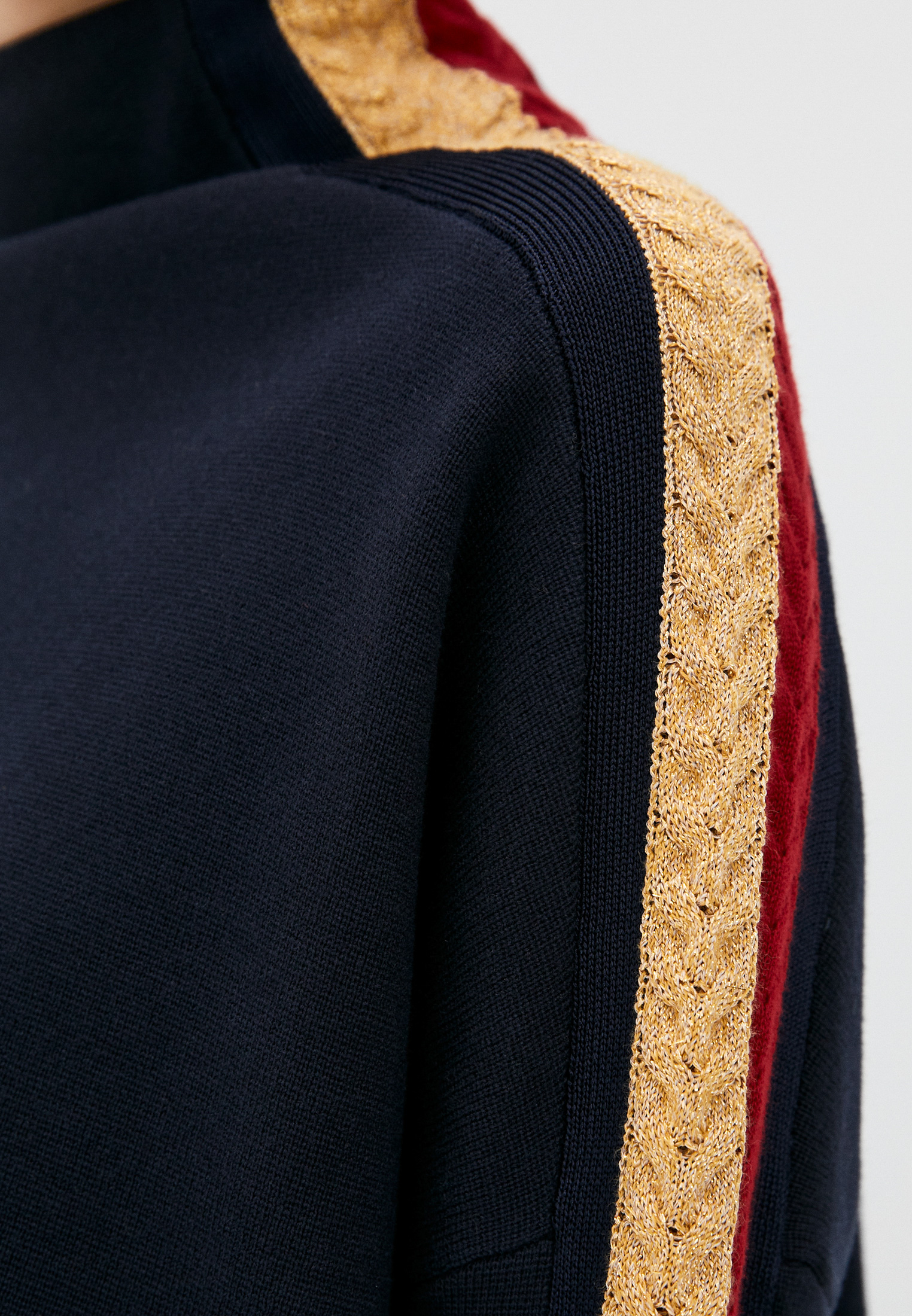 Laisvas megztinis aukšta apykakle, dekoruotas kontrastingomis juostelėmis su liureksu ant rankovių. Modelis pagamintas iš tankaus megzto audinio ir turi šiek tiek prailgintą nugarą.