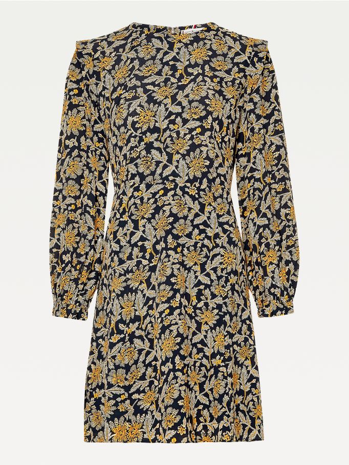 Priglundanti ir platėjanti forma pagaminta iš viskozės krepo. Suknelė ilgomis rankovėmis, gėlių raštas nepriekaištingai priglunda prie kūno. Apvali apykaklė, paraukimai ant pečių, mini ilgis, užsegimas užtrauktuku.