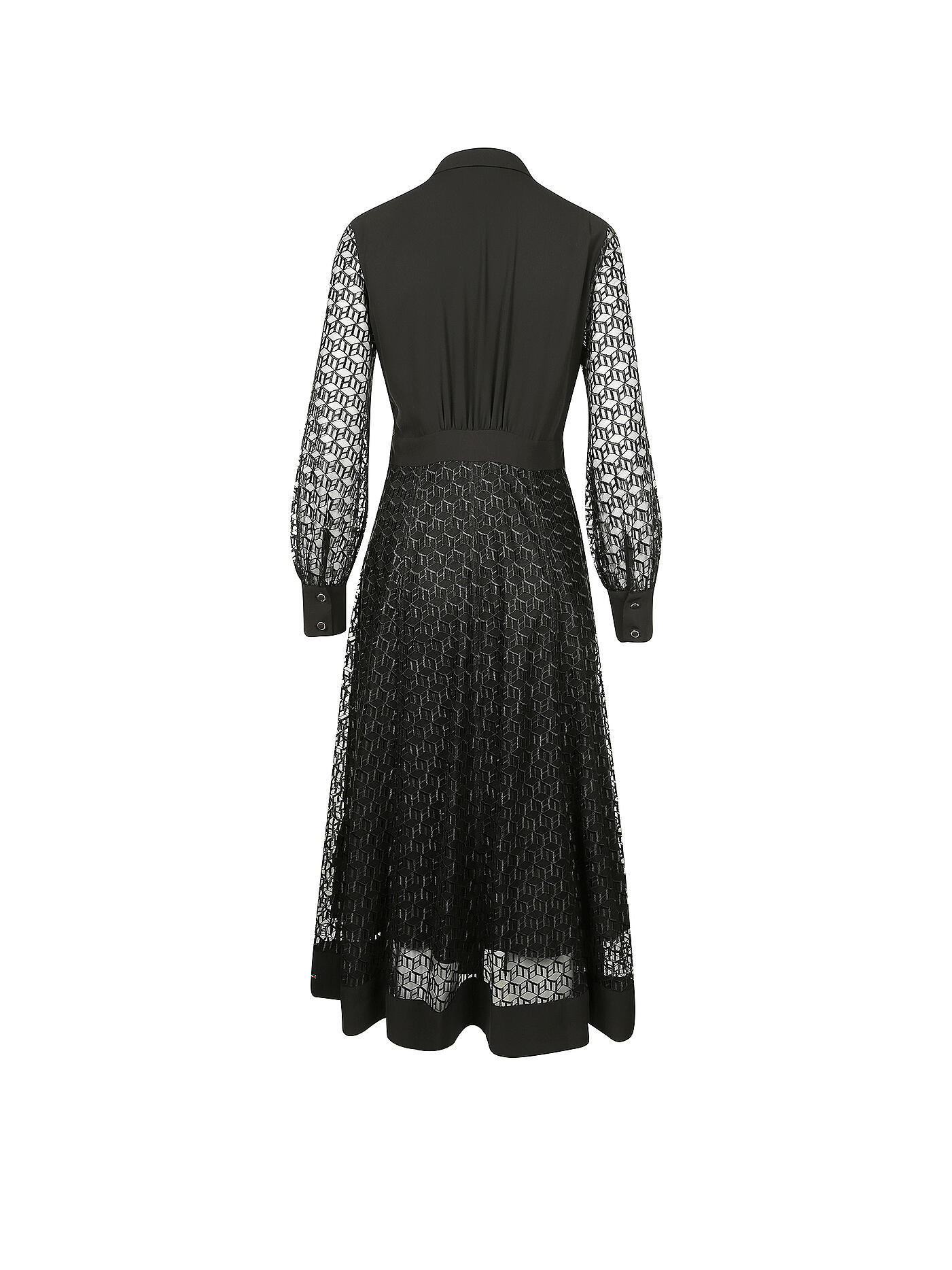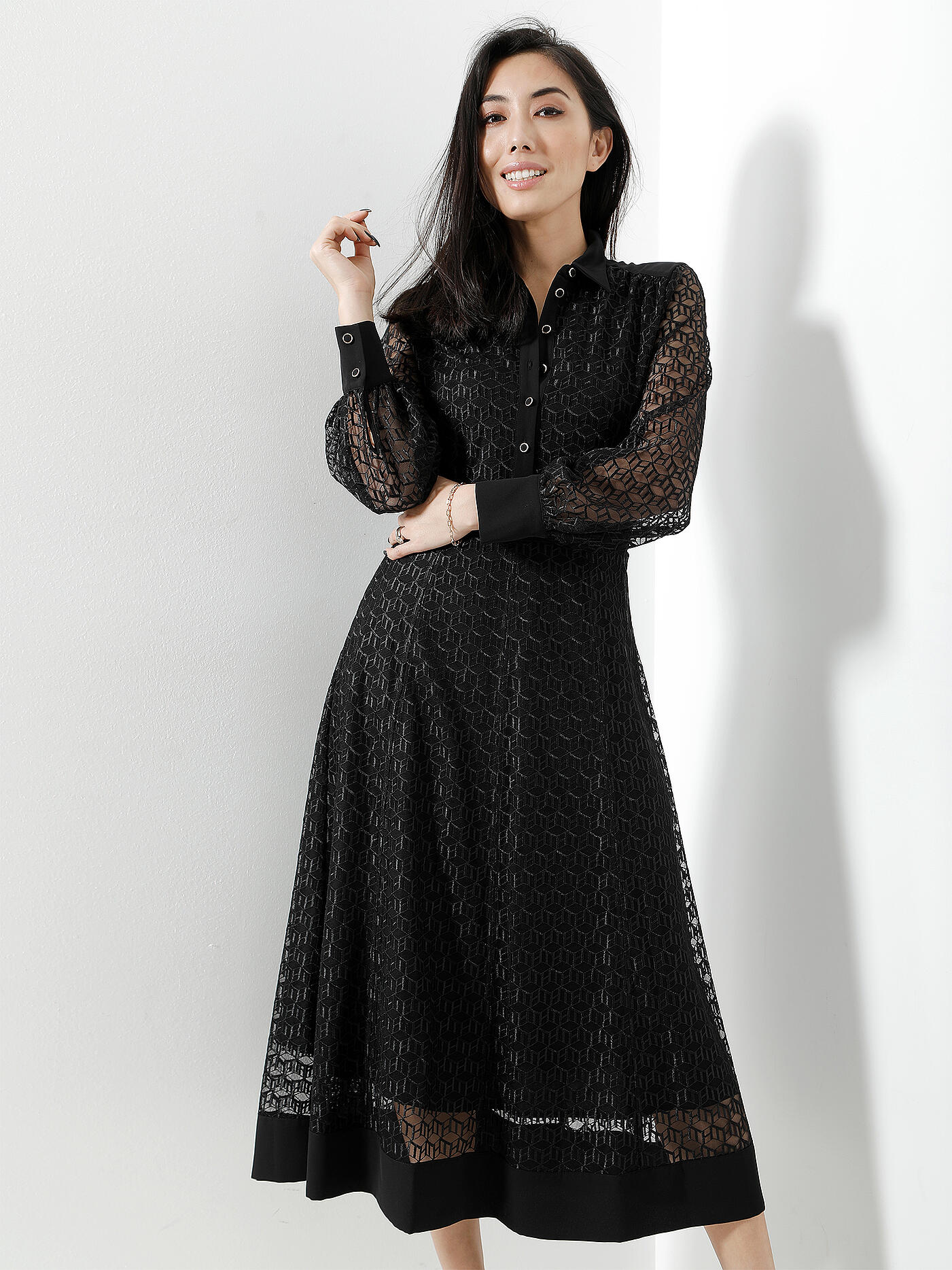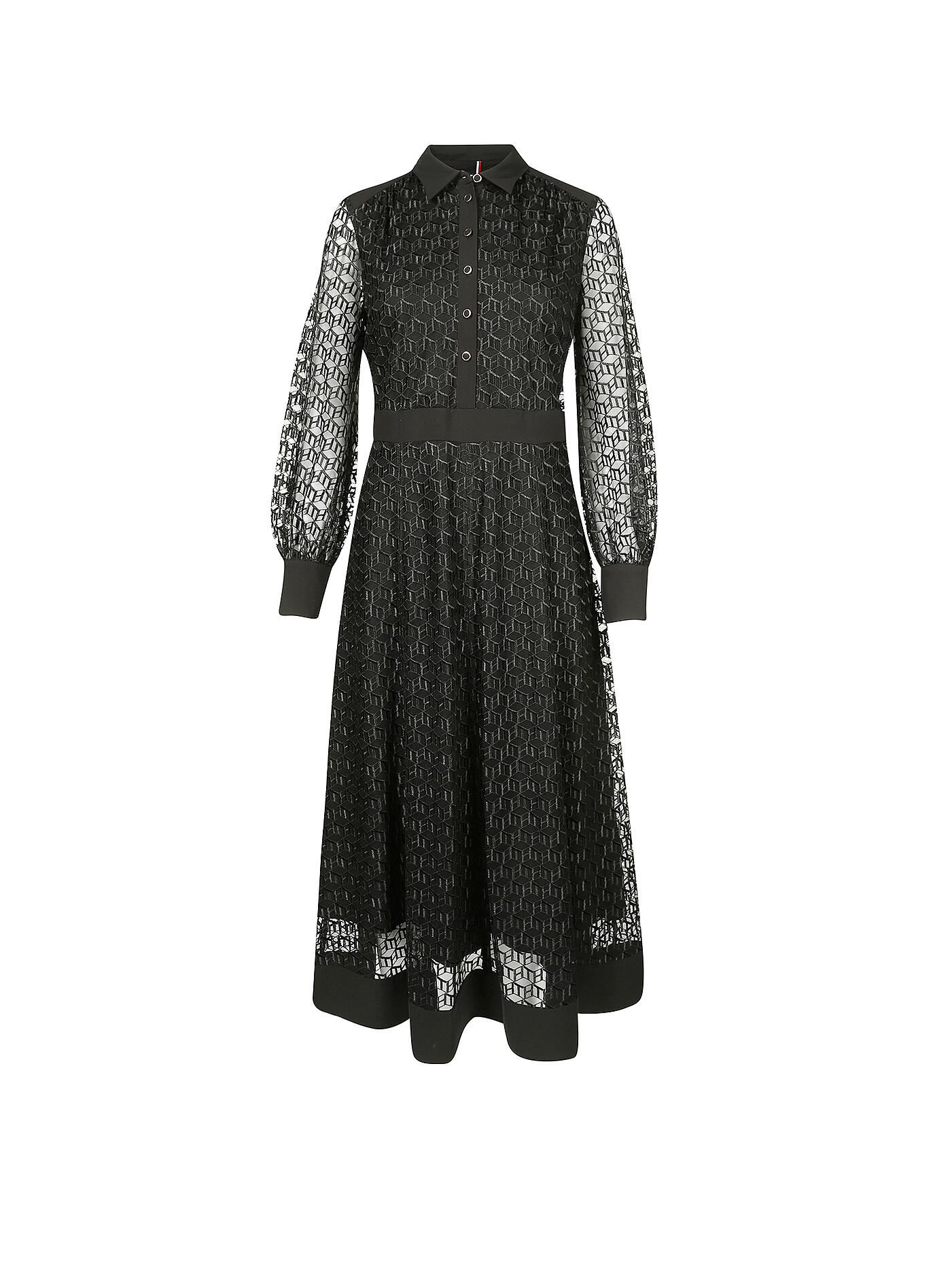 Moteriška suknelė Tommy Hilfiger modelio Mesh Emb F&F Maxi Dress Ls. Kokybiškas audinys. Visą raštą sudaro siuvinėjimas iš prekės ženklo monogramos. Marškinių apykaklė su 6 sagų užsegimu. Šone vidinis užtrauktukas. Rankovės su sagomis. Klostuotas sijonas su pamušalu. Prisiūta Tommy Hilfiger vėliavėlė prie apačios.