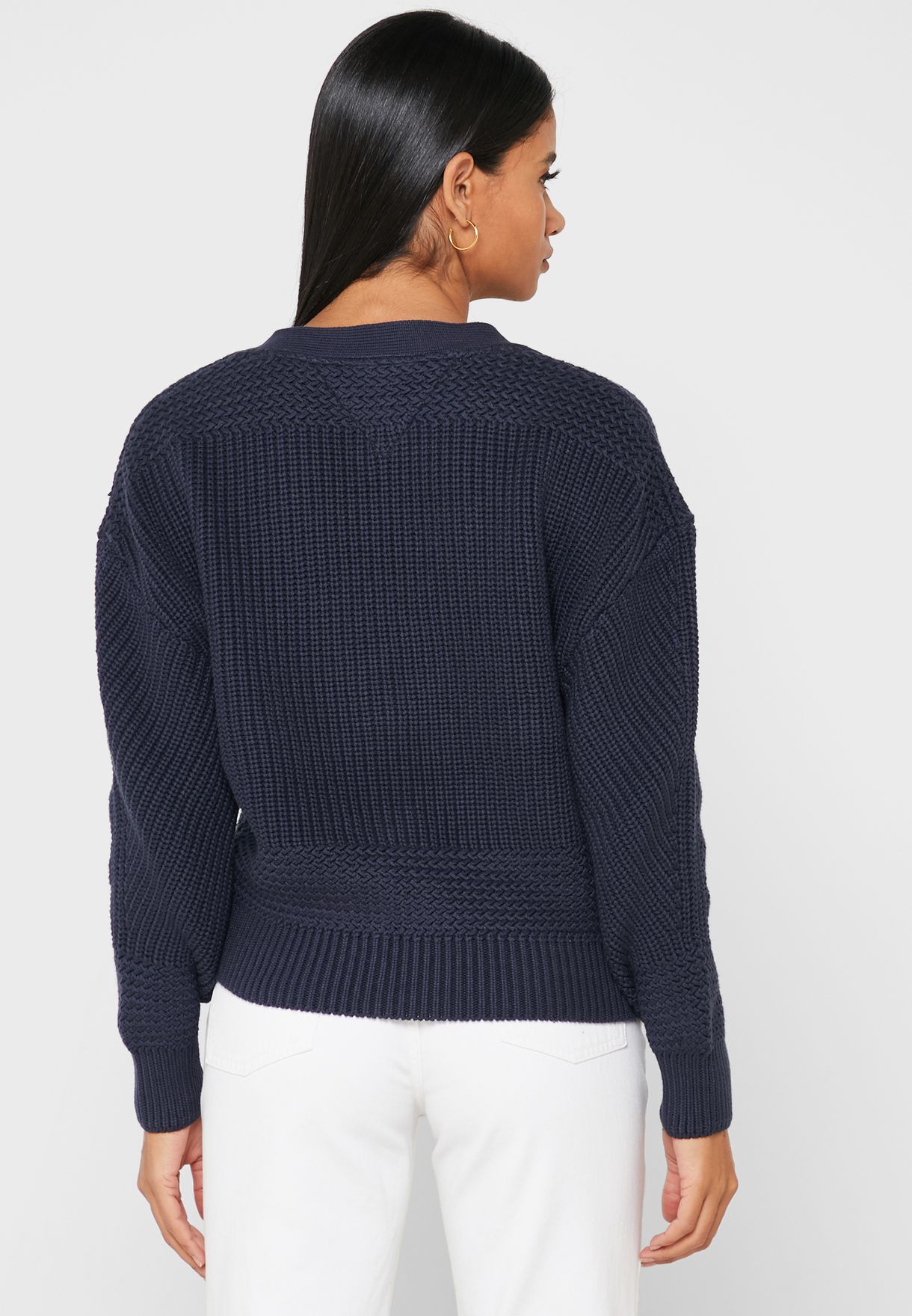 Megztas ir šiltas medvilnės mišinio audinys. V formos iškirptė ir ilgos rankovės. Nuleistos pečių siūlės. Visur briaunotos apdailos. Užsegimas spaudėmis. Vienspalvis dizainas papildomas siuvinėta prekės ženklo emblema.