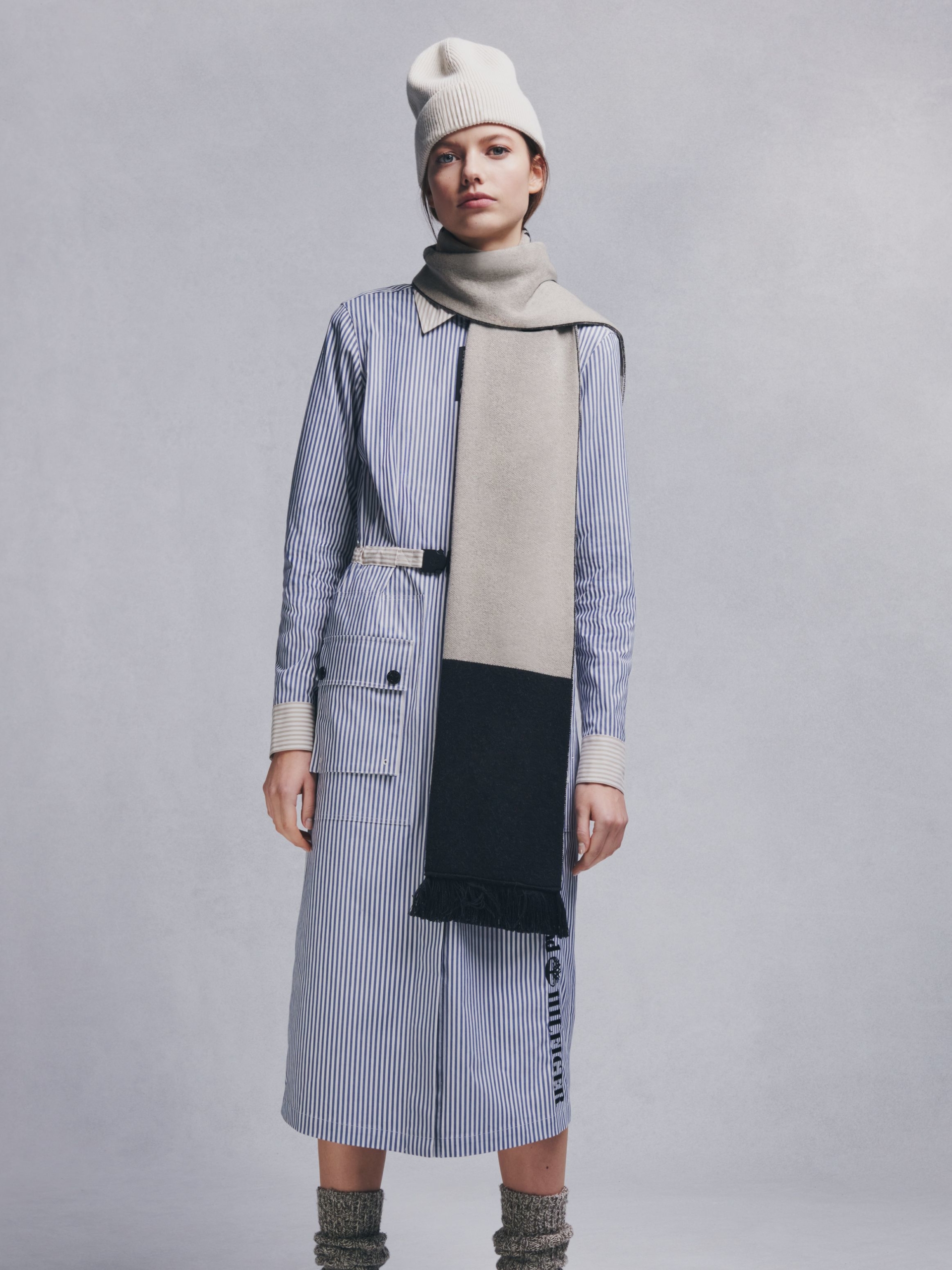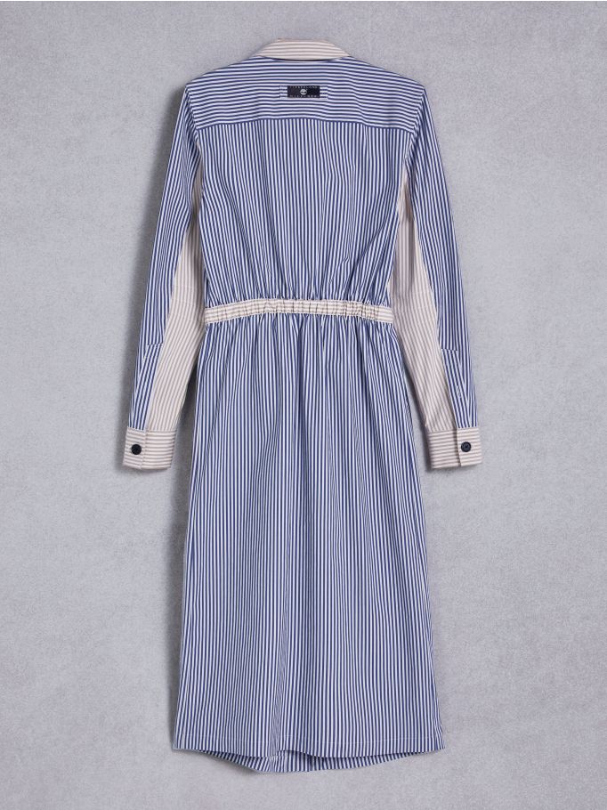 Ši midi ilgio dryžuota suknelė pasižymi firminiu diržo segtuku ir išskirtiniais logotipais. Pagaminta iš perdirbto poliesterio ir medvilnės audinio. Pusiau išskleista apykaklė. Elastingas juosmuo su greitai atsegamu segtuku. Dvi šoninės kišenės. Dvi priekinės kišenės su užsegamais mygtukais. TOMMY X TIMBERLAND prekės ženklas.