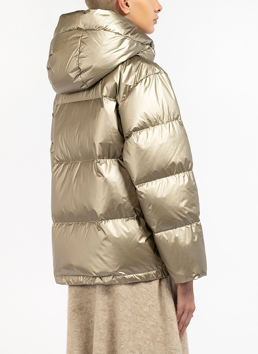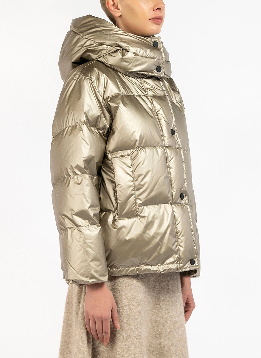 Weekend Max Mara dygsniuota striukė, modelis Genepi, pasiūta iš sintetinio vandeniui atsparaus matinio blizgančio nailono su metaliniu efektu. Tiesaus silueto, aukšta apykakle ir gobtuvu, ilgomis rankovėmis su užtrauktuku, dvi kišenės, užsegimas paslėptu užtrauktuku.